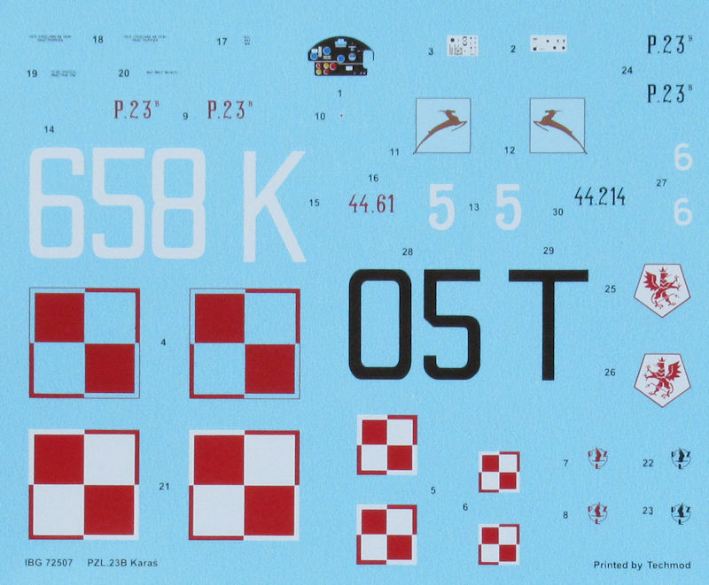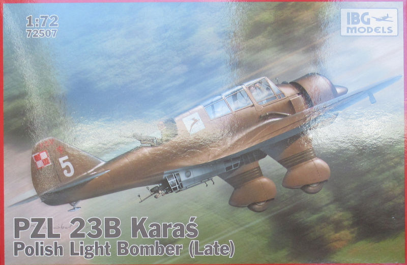 Bausatz: Lange Zeit gab es in 1/72 nur den Heller-Bausatz der PZL. 23B. So war ein zeitgemäßer Bausatz längst schon überfällig. IBG bearbeitet das Thema sehr ausführlich und so gibt es für jede Modifikation einen separaten Bausatz. Hier geht es um die späte Ausführung. In dem attraktiven praktischen Stülpkarton befinden sich gut verpackt sieben hellgraue Spritzrahmen mit 51 Einzelteilen, ein Klarsichtrahmen mit zwölf Teilen, ein kleiner Fotoätzteilbogen, ein Decalbogen und die Bau- und Bemalungsanleitung.