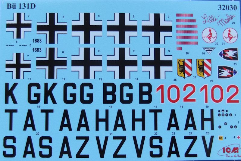 Bemalung: Die schöne farbige Bauanleitung gibt auch Aufschluss über das Anbringen der Verspannung. Neben zwei Vorschlägen für eine Maschine der deutschen Luftwaffe in den Farben Grau RLM 02 , gibt es eine Variante die besonders hervorsticht, und auch das Deckelbild des Stülpkartons ziert. Es handelt sich um eines der Flugzeuge, welches vor dem Krieg nach Jugoslawien verkauft und im Zuge des Balkankrieges wieder erbeutet wurde. Die Maschine mit der Kennung KG-GB gehörte 1942 zum Jagdgeschwader 54 wo sie zu ihrer Standardtarnung RLM 71/ 75 noch einen besonderen Winteranstrich. Außerdem sind der Schriftzug "Lili Marlen", nach dem Soldatenlied, welches von der Sängerin Lale Anderson interpretiert wurde und die vielen Striche am Leitwerk auffällig. Abschussbalken oder Einsätze, das ist die Frage?