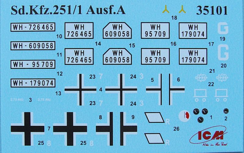 Bausatz: ICM hat sein Modell des Sd.Kfz.251/1 in der Ausführung A in einer erweiterten Form herausgebracht. Das Fahrzeug erhält als Zugabe einen ICM Satz (35639) mit sehr schön gestalteten Figuren mit gut gelungenen Posen. Weiterhin liegt diesem Set ein Waffensatz bei. Dieser ist natürlich auch einzeln immer gut zu gebrauchen.