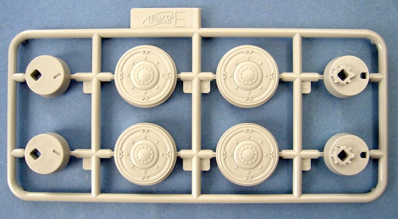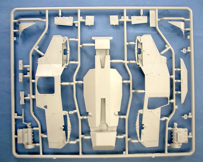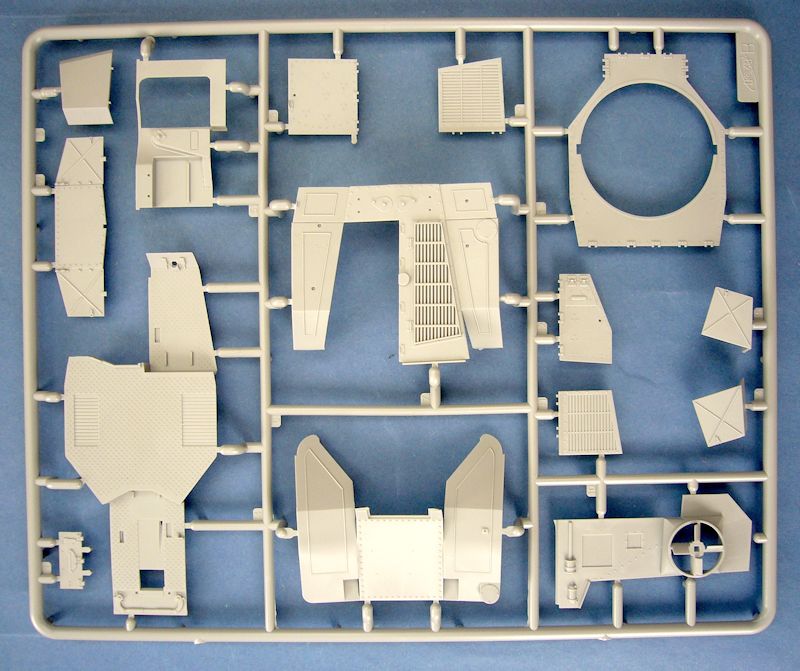 Bausatz: Im sehr stabilen Umkarton, der auch wieder einen separaten Stülpdeckel aufweist, findet man insgesamt fünf Spritzlinge aus hellgrauem Material, wobei die Rahmen A, B, C und E vom Basisbausatz übernommen wurden.