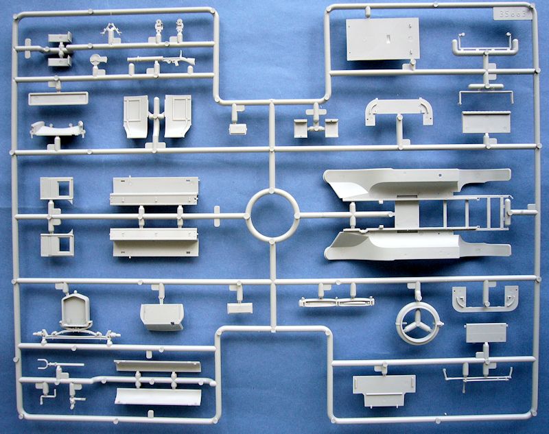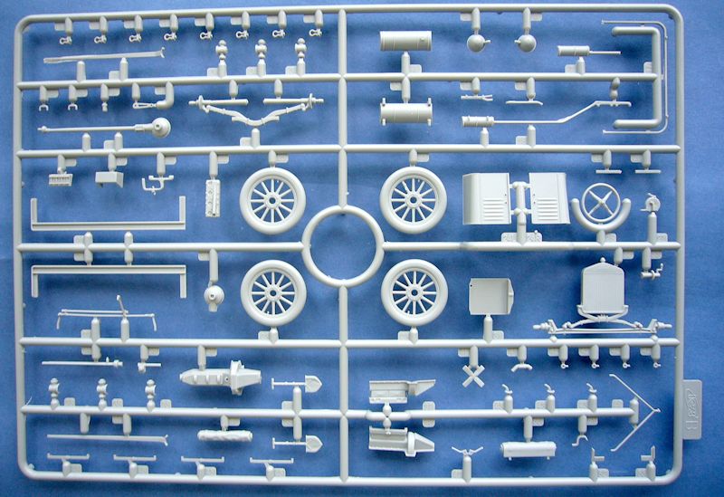 An einem großen Spritzling aus hellgrauem Plastik befinden sich die wesentlichen Bauelemente des Fahrzeuges. Daneben ist noch ein kleinerer Gussast enthalten, der neben den Rädern auch Kleinteile sowie einen kompletten Motor enthält.