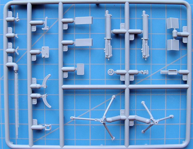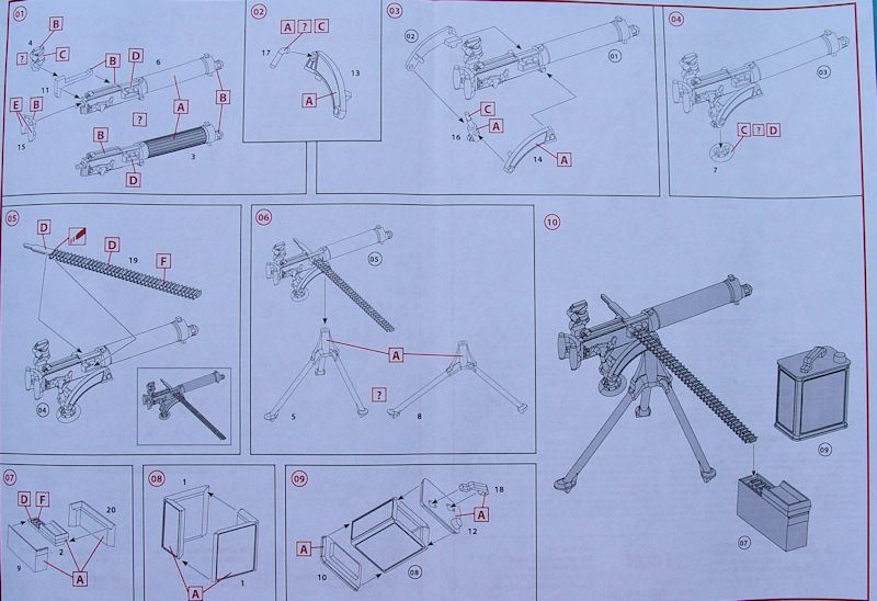 Bausatz: Für das kleine Modell des Vickers Maschinengewehr gibt es nur einen Spritzrahmen aus grauem Kunststoff. Der MG-Lauf ist zweigeteilt, aber alles passt sehr gut zusammen. Man kann das MG ist zwei verschiedenen Aufbauhöhen darstellen. Dazu liegen dem Bausatz zwei verschiedene Dreibeine bei.