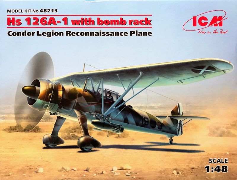 Bausatz: ICM bietet den Aufklärer in unterschiedlichen Ausführungen an, nun auch die frühe Version A-1, die auch bei der Legion Condor eingesetzt wurde. Die Boxart ist sehr schön gestaltet und zeigt eine dieser Maschinen beim Start oder der Landung auf einer feldmäßigen Piste.