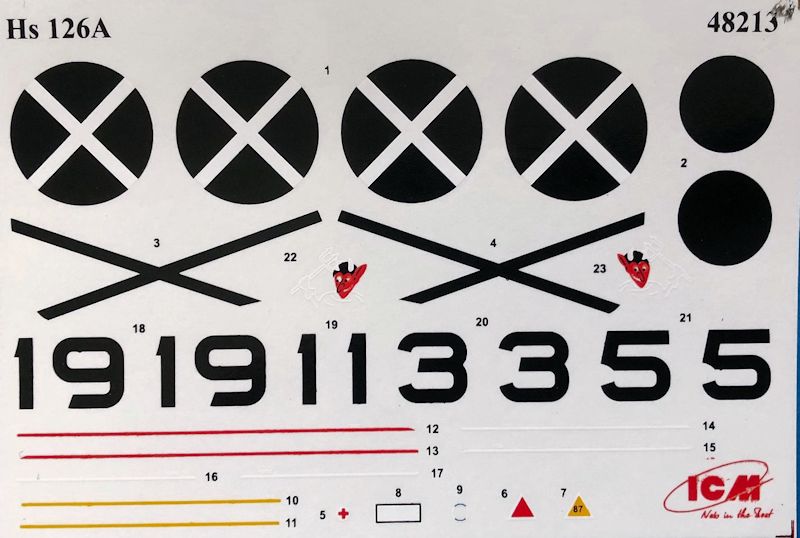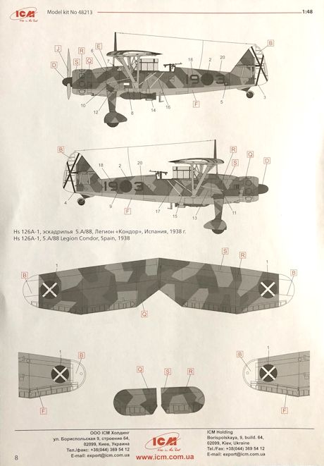Anleitung/ Bemalung: Der Bauplan besteht aus einem achtseitigen Heft, das über 17 Schritte durch den Bau führt. Die Abbildungen sind in schwarz/weiß gehalten und sehr klar und übersichtlich ausgeführt. Bei den Farbangaben wird sich auf die Palette von Model Master bezogen. Die beiliegenden Abziehbilder ermöglichen den Bau von zwei unterschiedlichen Flugzeugen der Legion Condor.
