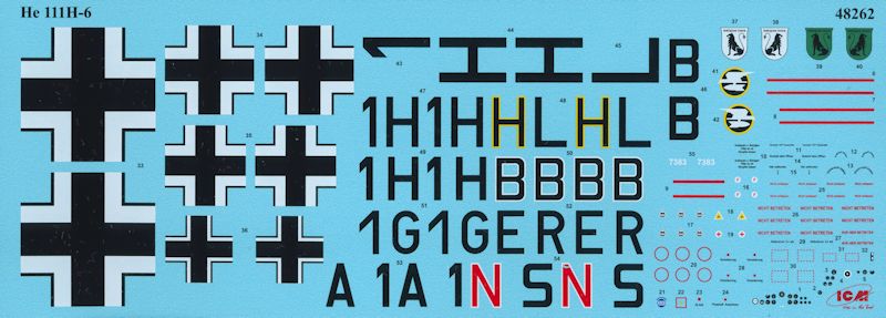 Bausatz: Der ukrainische Hersteller ICM hat nach der Heinkel 111H-3 eine weitere Version auf den Markt gebracht. Der Bausatz besteht aus 12 Spritzlingen mit insgesamt 388 Einzelteilen und 27 Klarsichtteilen. Davon sind sechs für die H-6.