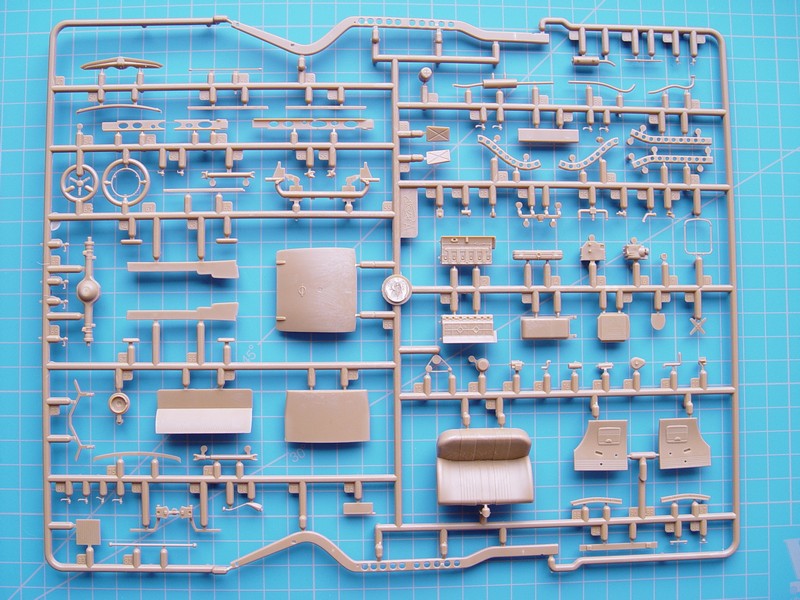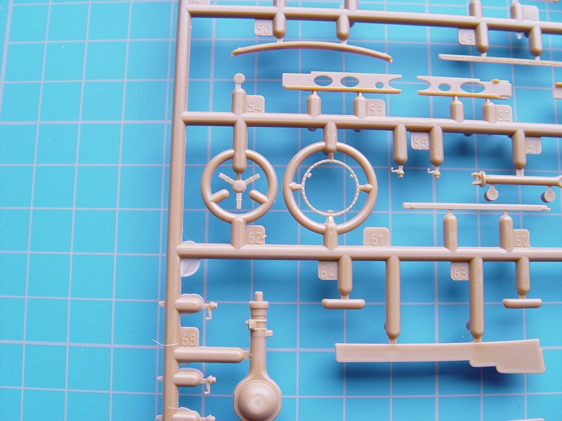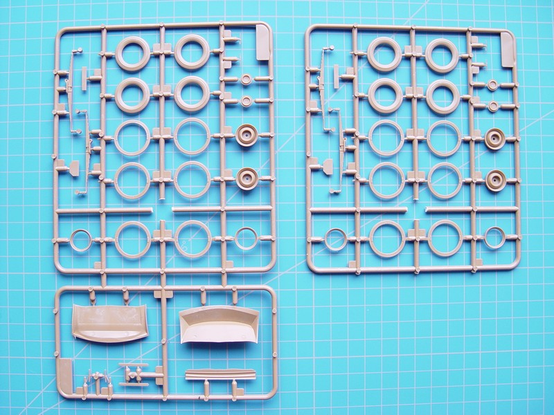 - zwei große Spritzrahmen (A4 Format) aus gelben Kunststoff. Sie sind sauber gegossen. Einige Bauteile weisen Auswerferstellen auf. Diese sind aber so günstig angelegt dass diese Stellen kaum stören.