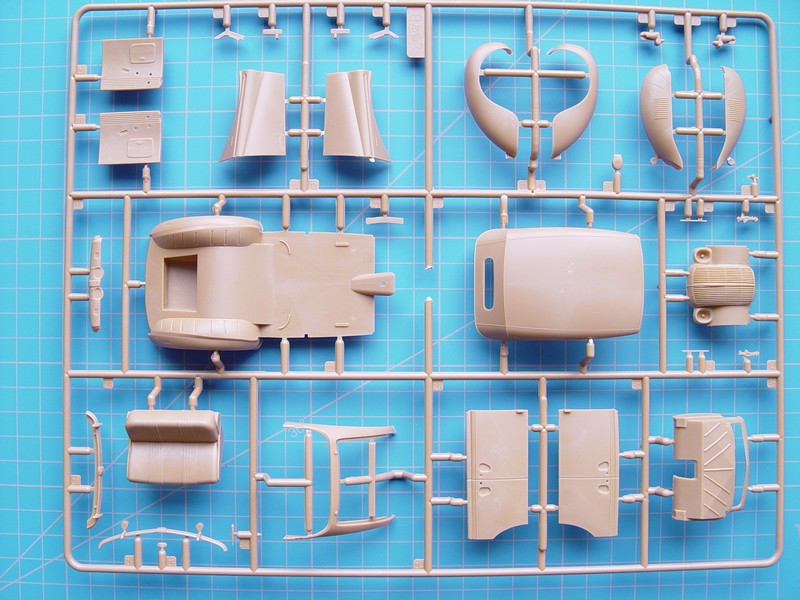 - Die Bodenplatte, Kühlergrill, Sitzbänke sowie Kotflügel sind gut gelungen. Eigentlich alle Teile. Sicherlich könnte man aber durchaus den Kühlergrill mit Ätzteilen verbessern… Da wartet bestimmt schon der Zubehörmarkt. Bei den Seitentüren wäre zu erwähnen dass diese für Vorn und Hinten aus einem Bauteil besteht. So kann man eine/ beide Türen nicht offen darstellen. Gerade bei diesem Modell ist dies Interessant. Die Hinteren Türen gehen nämlich nach hinten auf. Das sieht man ja heute nicht mehr oft.