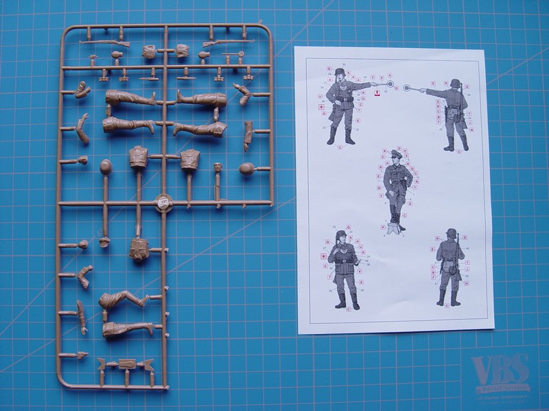 - Ein Spritzrahmen mit 5 Figuren. 4 Wehrmachtssoldaten und ein Offizier. Auf den ersten Blick kann man sagen, bei den Figuren liegt nicht die Stärke des Bausatzes.