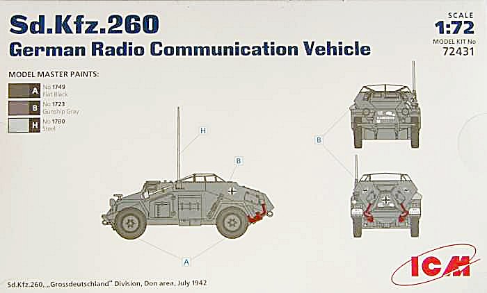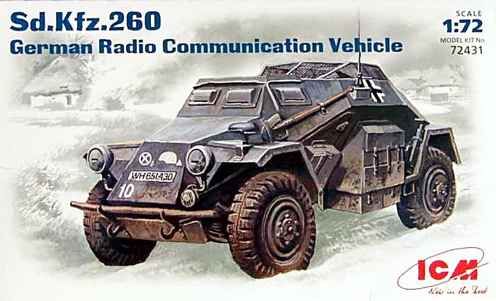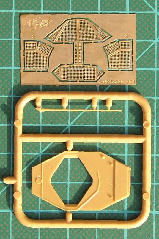 Bausatz: Es war schon eine Überraschung, dass ICM eine Serie des leichten Panzerspähwagens in 1:72 ankündigte. Der modulare Aufbau des Bausatzes lässt darauf hoffen, dass alle Ausführungen Stück für Stück erscheinen. Ein Manko der Bauanleitung ist, dass keinerlei Informationen zum Original vorhanden sind. Der Bausatz enthält einen großen Spritzling und einen kleineren, der die spezifischen Teile für das Sd.Kfz. 260 enthält. Ungewöhnlich für einen Bausatz dieser Preisgruppe ist die Zugabe einer Ätzteilplatine. Diese wird benötigt, um die Gitterabdeckung des Fahrzeuges darzustellen. Die Abspritzung der Teile ist vorbildlich und die Detaillierung der Teile ist in Ordnung. Der Freak findet natürlich wieder genug zum Verbessern. Zwei verschiedene Fahrzeuge werden in der Bemalungsanleitung vorgestellt. Die restlichen Decals wandern in die Restekiste, da die übrigen Kfz-Kennzeichen für die anderen Sd.Kfz. dieser Reihe vorgesehen sind. Gesetzeskonform wurden die SS-Runen unkenntlich gemacht.