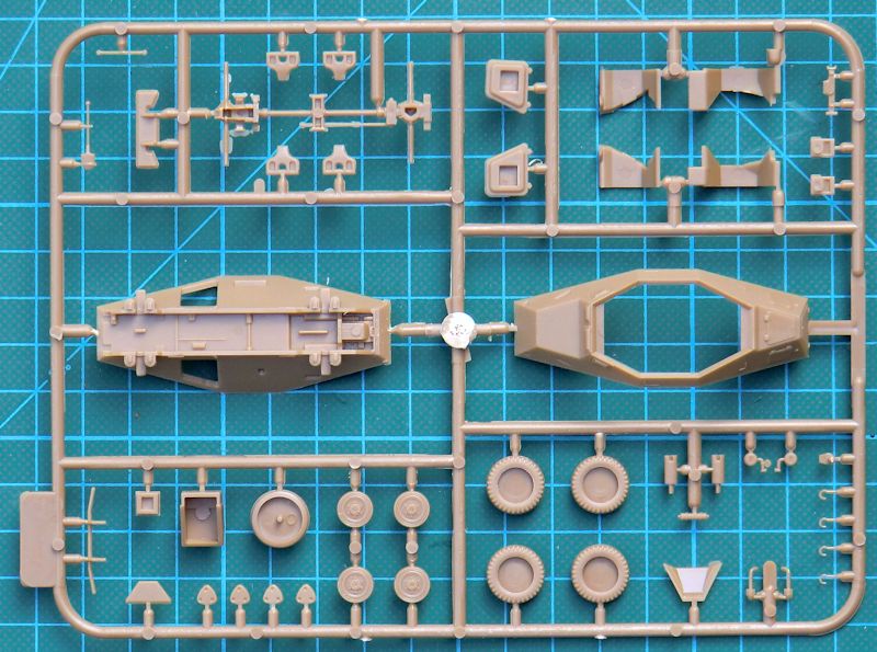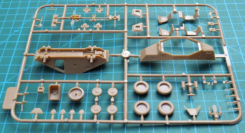 Bausatz: In der typischen unpraktischen Schüttbox von ICM befinden sich gut verpackt drei beigefarbene Spritzlinge mit 46 Teilen, ein Fotoätzteilbogen, ein Decalbogen und die Bauanleitung. Die meisten Bauteile sind aus anderen ICM-Bausätzen vorhanden. Begeistern kann die ordentliche Abspritzung der Bauteile.