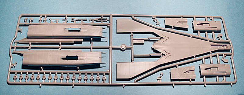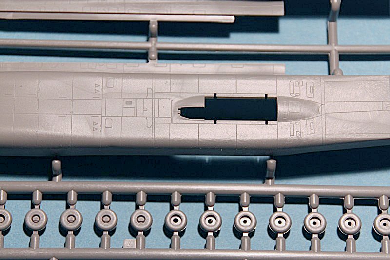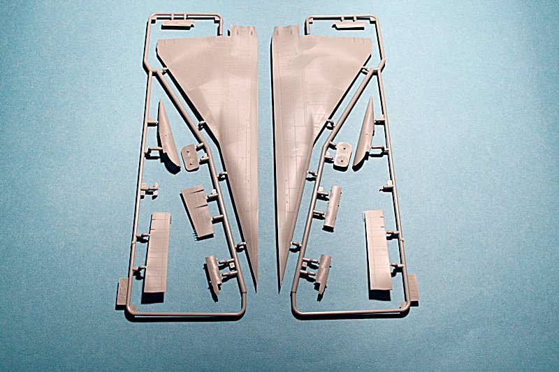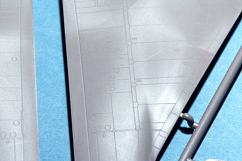 Der erste Blick zeigt eine extrem detaillierte Oberflächengestaltung. Der Kunststoff hat eine matte Oberfläche. Die Gravuren sind sehr fein und zeigen sehr viele Details. Hier ist eine Lackierung per Airbrush wohl Pflicht. Die Aufteilung der Trag- und Stabilisierungsflächen ist so gewählt, dass sich sehr scharfe Vorder- und Hinterkanten ergeben. Seitenruder und die Flügelklappen sind separat, wobei eine Darstellung mit abgesenkten Lande- und Steuerklappen nicht so einfach geht, da die Schienenverkleidung einteilig sind und den eingefahrenen Zustand zeigen.
