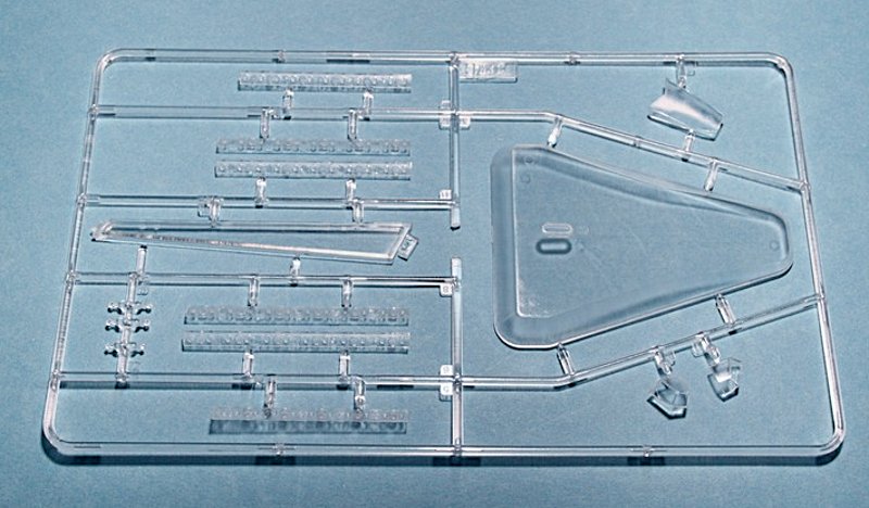 Kehren wir zum Bausatz zurück. Der klare Spritzling, welcher separat in Folie verpackt ist, enthält die Teile für das Cockpit, ein Teil für die klappbare Nase und die Passagierfenster. Mit einer entsprechenden Maskierung sollte dies nach der Lackierung gut aussehen. Zusätzlich ist ein großer Ständer für eine Flugdarstellung vorhanden. Die Abziehbilder sind matt gedruckt und sehen gut aus. Der Bogen enthält Decals für zwei Serienmaschinen: