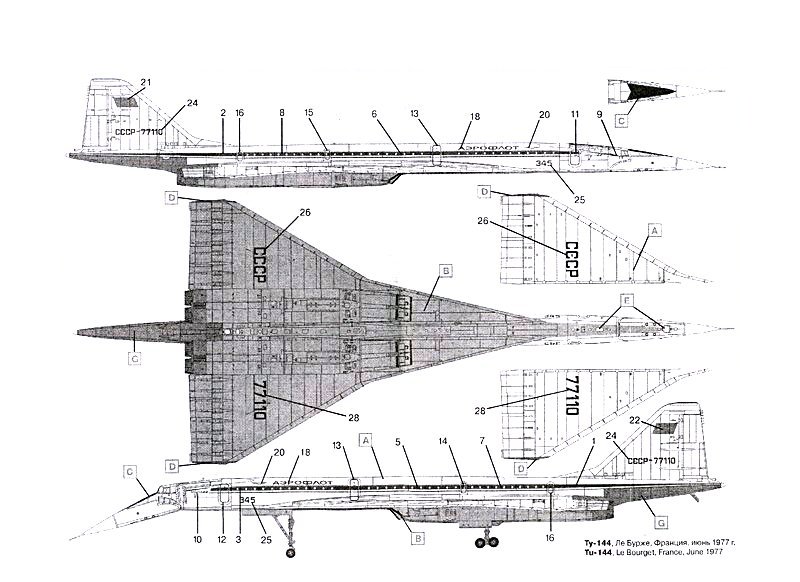 Vorbild: Die Tu-144 war das erste Überschallverkehrflugzeug der Welt und bildete das sowjetische Gegenstück zur westlichen Concorde. Erstes deshalb, weil der Prototyp am 31.12.1968, 61 Tage vor dem Erstflug des französisch-britischen Parallelentwurf, zu seinem Erstflug abhob. Spötter bezeichnen sie als „Concordski“, was aber nicht ganz zutreffend ist. Zweifelsohne gab es Industriespionage seitens der Sowjetunion, aber es gibt auch Stimmen, die auch von „Forschungen“ in der anderen Richtung sprechen.