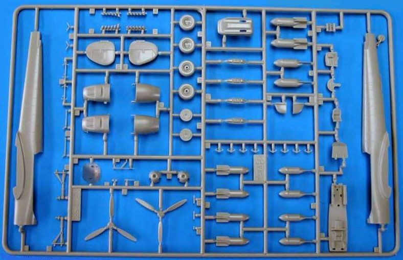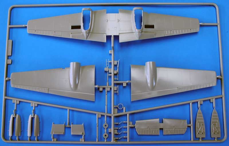 Hatte man gerade die Enttäuschung darüber verdaut, dass der ein Jahr vorher herausgekommene Nachtjäger-Bausatz unbegreiflicherweise noch erhabene Gravuren hatte, bemerkte man nun, dass es sich dabei auch noch um eine Form handelte die gleich für mehrere Bf 110-Baureihen Rümpfe und Tragflächen liefern sollte. Ein Teilbereich an einem der zwei taubengrauen Gussrahmen variabel gehalten woran man diverse Bauteile der verschiedenen Varianten platziert hatte. Deren Anordnung war recht rationell durchdacht und zwar so, dass unnötige Teile des einen Modells nicht noch am Spritzling des andern geisterten.