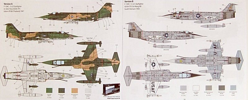 Für die Dekoration stehen vier Möglichkeiten zur Auswahl. Von den zwei amerikanischen Starfighter aus der Vietnamkriegszeit, präsentiert sich ein Flugzeug in der Süd-Ost Asien Tarnung. Eine Maschine der Operation „Jonah Able“ die zu 12 Starfightern gehörte, die 1958 nach Taiwan eingeflogen wurden, um die Volksrepublik China daran zu hindern National-China anzugreifen. Die Maschinen kamen nicht zum Einsatz, wirkten aber abschreckend. Außerdem kann noch eine Maschine der Taiwanesischen Luftwaffe aus dem Jahr 1969 gebaut werden.