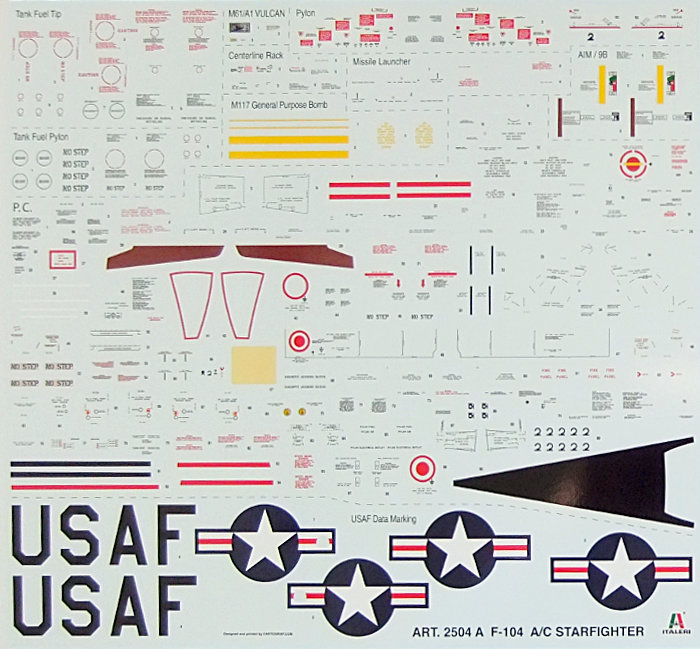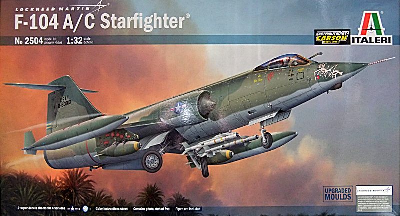 Bei dem uns vorliegenden Bausatz, handelt es sich um die klassische amerikanische Variante des „Starfighters“: Des Abfangjägers F-104 A/C, welcher auch eine kurze Einsatzperiode im Vietnam-Konflikt hatte. Wer sich für eine F-104 A entscheidet, muss - bis auf die AIM 9B Raketen - auf die Ausrüstung mit alternativen Waffen verzichten. Auch der Einbau der Vulcan-Kanone würde wegfallen, da diese erst ab etwa 1964 serienmäßig eingebaut wurde, da es bis dahin mit der Zuverlässigkeit der Waffe haperte. Die F-104 C allerdings, Erstflug 1958, bekam ein stärkeres Triebwerk General Electric J 79-GE-7 und konnte daraufhin mit einer effektiveren Bewaffnung ausgerüstet werden. Außerdem war eine abnehmbare Luftbetankungssonde vorgesehen. Der „Starfighter“ wurde nun auch als Jagdbomber eingesetzt.