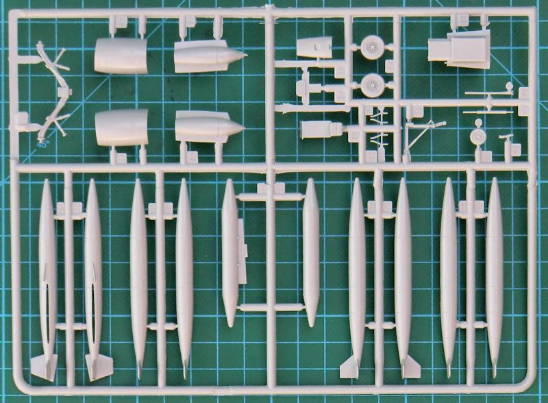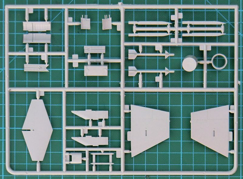 Die Bauteile haben feine versenkte Strukturen. Im Cockpit geht es einfach zu. Hier gibt es eine glatte Wanne auf die dann Decals aufgebracht werden. Der Schleudersitz ist simpel. Immerhin sind dort Gurte aufmodelliert. Die beiden Tragflächenhälften sind sehr dünn.