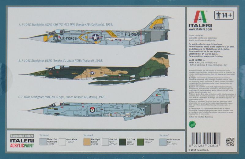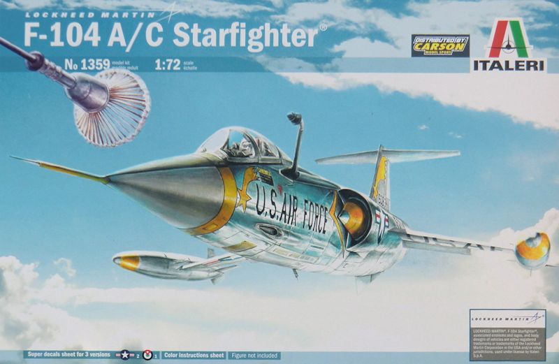 Bausatz: Bei Italeri erscheinen regelmäßig Auflagen der verschiedenen Versionen der F-104 Starfighter in 1/72. Nun gibt es die F-104A/C in einer attraktiven aber unpraktischen Schüttbox. Darin befinden sich gut verpackt drei hellgraue Spritzlinge mit 55 Einzelteilen, eine einteilige Klarsichtkanzel, ein Decalbogen und die typische Bauanleitung.
