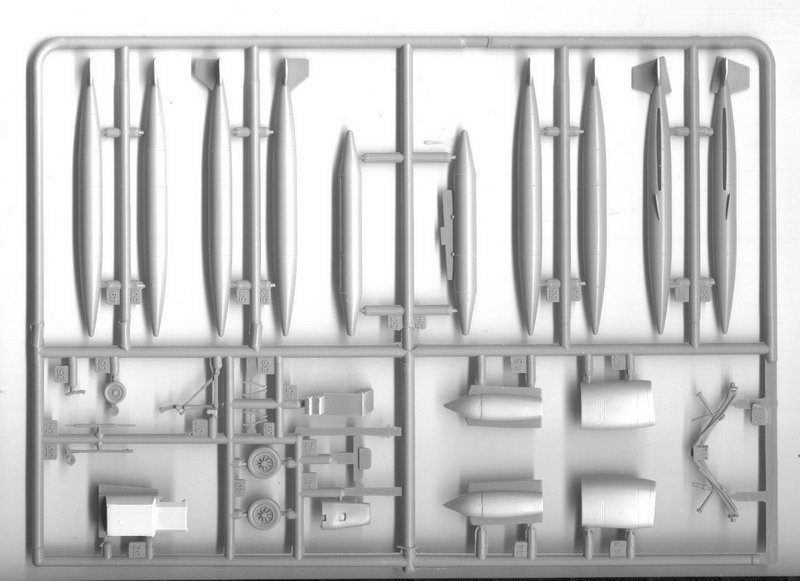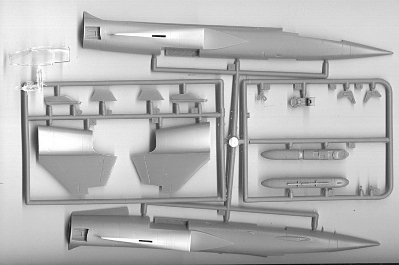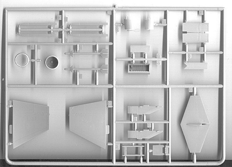 Der Bausatz besteht aus 3 hellgrauen Spritzlingen, einem Klarteil und einem Decalbogen. Alles ist sauber gespritzt und mit feinen Gravuren versehen. Die Kanzel ist so klar, dass man kein FUTURE braucht. Vermutlich hat ITALERI die Spritzform von AMT übernommen, die Teile sind identisch. ITALERI hat den Bausatz aufgewertet, in dem sie einen Martin-Baker-Sitz dazu gepackt haben und noch ein paar Zurüstteile.