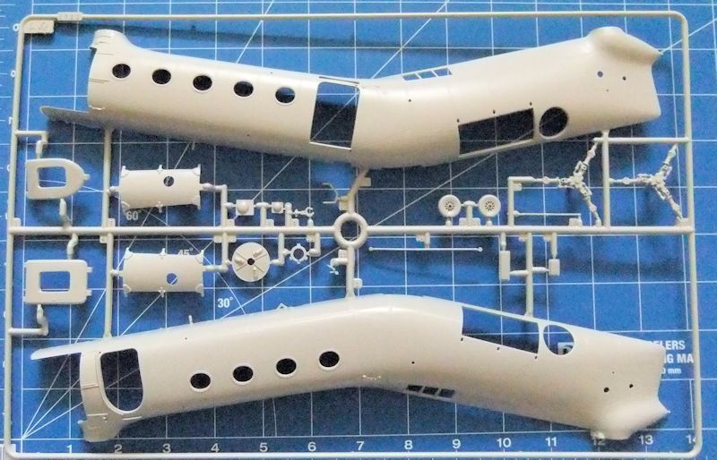 Bausatz: Nun schälen wir unsere "Banane" mal aus ihrem Stülpkarton. Die Formenneuheit ist von Grund auf schön gemacht. Daher widerspreche ich der im Netz geäußerten Behauptung über zu kräftig ausgeführte Gravuren bzw. Nieten. Im Gegenteil machen die Gravuren auf den beiden Rumpfhälften einen sehr authentischen Eindruck. Zugegebenermaßen, wirkt die Rumpfoberfläche bei näherem Hinsehen und unter Licht betrachtet, an einigen Stellen etwas körnig. Aber das ist kaum der Rede wert.
