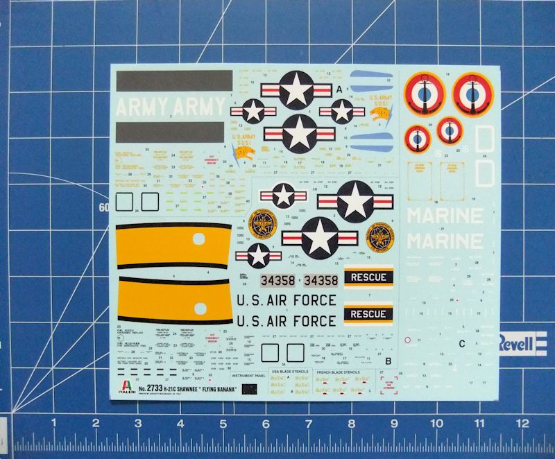 Ein Kritikpunkt, sind die fehlenden Zusatztanks. Diese waren insbesondere bei allen Ausführungen der H-21 M.A.T.S. Rettungseinheiten vorhanden. Italeri bietet nämlich eine der farbenfrohen Varianten von 1960 an. Natürlich sind auf den Farbblättern diese tropfenförmigen Tanks vorhanden. Auch die Franzosen flogen mit diesen Behältern.