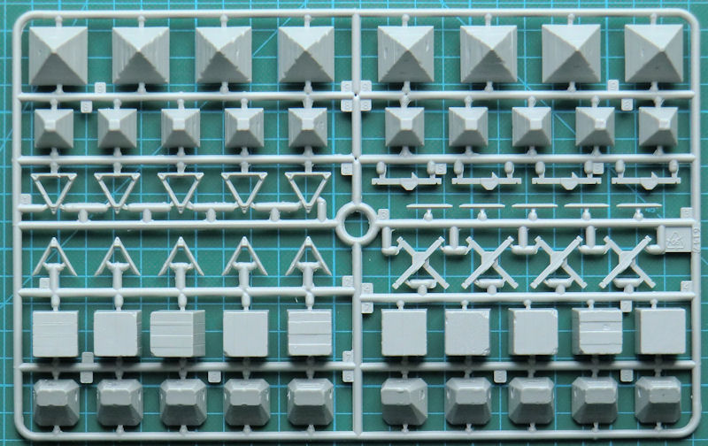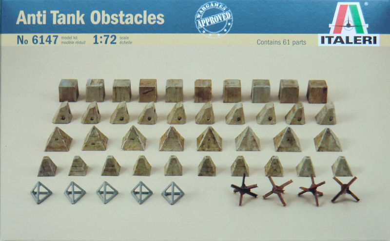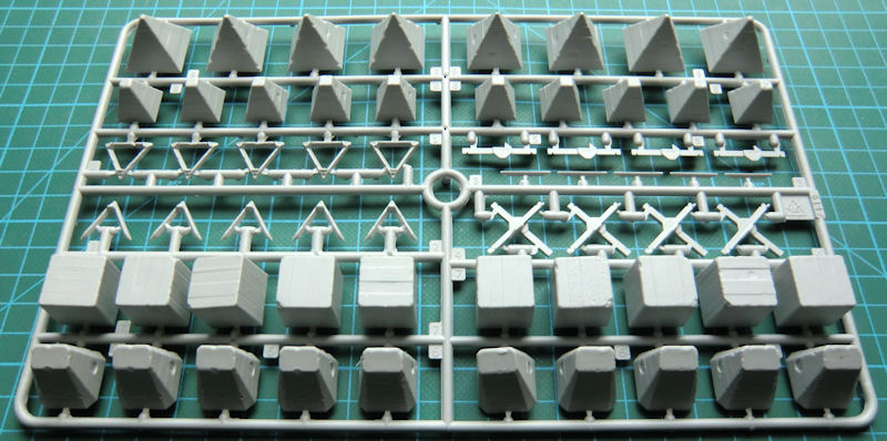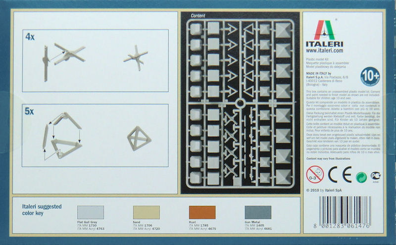 In der attraktiven Schüttbox befindet sich ein hellgrauer Spritzling mit 61 Einzelteilen. Die Kartonrückseite dient als Bauanleitung. Italeri liefert noch ein paar Farbangaben für das ModelMaster-Farbsystem. Mit wenigen Handgriffen hat man 47 verschiedene Panzersperren fertiggestellt.