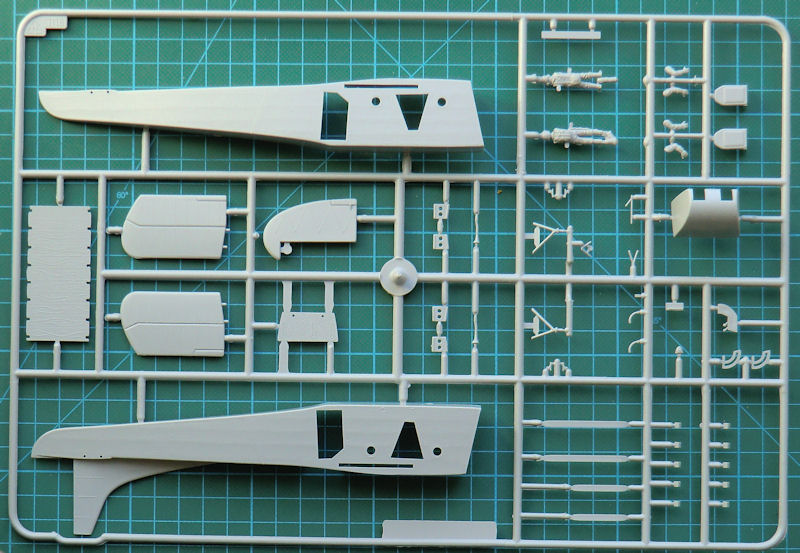 Im attraktiven praktischen Stülpkarton befinden sich gut verpackt zwei hellgraue Spritzgussrahmen mit insgesamt 130 Teilen, 12 Klarsichtteile, ein kleiner Decalbogen und die Bauanleitung. Die Oberflächenstruktur außen ist immer noch auf der Höhe der Zeit. Innen geht es eher rustikal zu. Das gut einsehbare Cockpit kann ein wenig mehr Details gebrauchen. Der Frachtraum ist leider innen auch etwas schwach. Immerhin gibt es ein paar Bänke. Alle Türen können geöffnet montiert werden. Zwei Figuren gibt es noch als kleine Dreingabe.