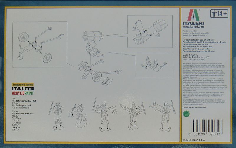 Bausatz: Italeri hat hier den deutschen 15 cm Nebelwerfer 41 mit Bedienungsmannschaft in 1/72 herausgebracht. In der attraktiven aber unpraktischen Schüttbox befinden sich gut verpackt zwei identische hellgraue Spritzlinge mit insgesamt 98 Teilen. Als Bauanleitung muss die Explosionszeichnung auf der Kartonrückseite herhalten.