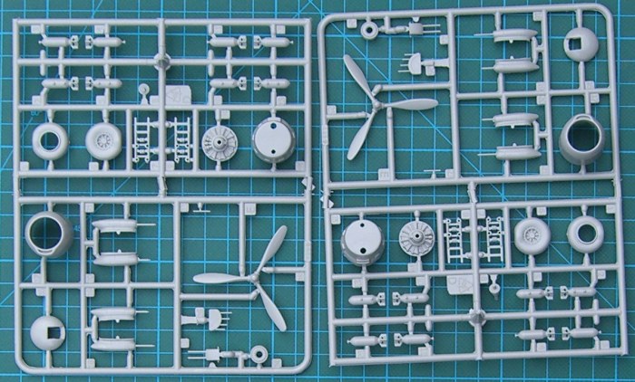 Alle für die A-26C benötigten Teile sind auf zwei separate Spritzlinge verteilt. Das sind die doppelt vorhandenen Spritzlinge E und D. Es sind jetzt vorbildgerecht nur die frühen Motorverkleidungen der B-26 vorhanden. Die Bugspitze liegt hier als Glasteil mit dabei
