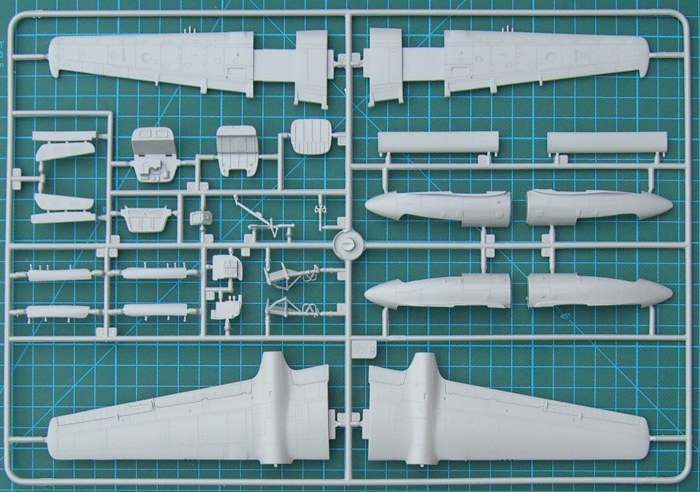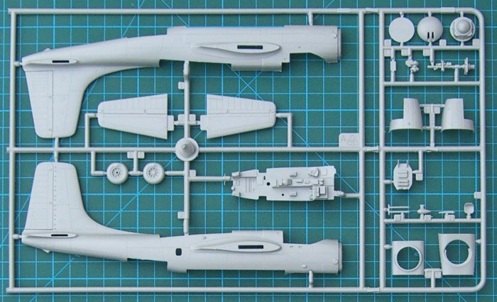 Kommen wir nun zum Bausatz. Die Spritzgussteile besitzen schöne Gravuren und auch die Rumpfseiten sind von innen detailliert. Das Cockpit ist recht gut ausgestattet und für diese Version auch richtig. Ein wenig Nacharbeit bzw. zumindest Gurte sollte man den Sitzen des Piloten und Copiloten spendieren. Diese sind durch die Verglasung gut einzusehen. Für das Instrumentenbrett gibt es ein Decal. Da Italeri auch die Rumpfspanten nicht vergessen hat, sind die Grundlagen für ein solides Modell vorhanden. Für das Buggewicht sollen 20 Gramm reichen. Bei der A-26C gibt es aufgrund des Glasbugs schon Probleme mit dessen Unterbringung.