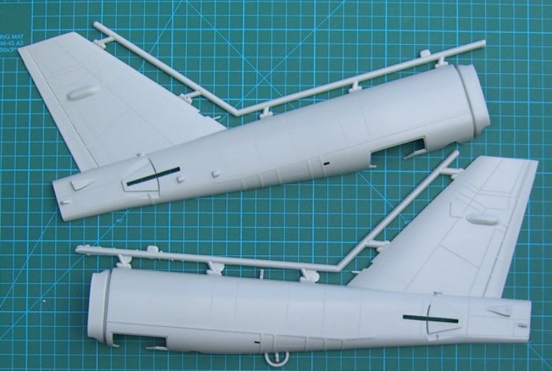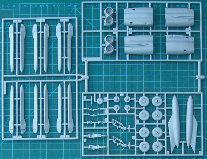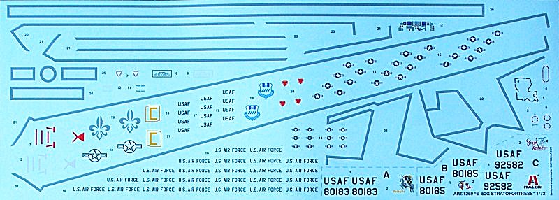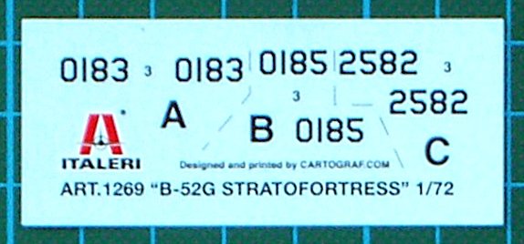 Bausatz: 2006 erschien die B-52H als Wiederauflage bei Italeri und nun erschien im Sommer folgerichtig auch die G-Version. Italeri hat 11 Jahre nach dem Erscheinen des Bausatzes bei AMT die B-52G wieder herausgebracht. Der Preis hat sich um gut 10 € nach oben entwickelt. Italeri hat nichts am Bausatz ergänzt und die Decals sind z.T. auch für dieselben Vorbilder. Wie bei AMT damals üblich, hat dieser Bausatz versenkte Gravuren. Damals wurden die Formen in Korea erstellt. Der Rumpf besteht aus vier Hälften. Das Cockpit ist recht gut ausgestattet und muss nur ordentlich bemalt werden, denn durch die Kanzel ist nicht viel zu sehen. Die Fahrwerksteile sind auch gut detailliert. Der Bausatz ist einfach solide. Es ist auch die einzige B-52G im Maßstab 1/72. Leider gibt es bisher kaum Zubehörteile (von ein paar Rädern von True Details mal abgesehen) für die B-52-Familie von AMT/Italeri. Eine nette Idee ist der Tragflächenholm. Wenn sauber gebaut wird, dann kann die Tragfläche einfach saugend aufgesteckt werden. Das vereinfacht den Transport dieses Brockens in 1/72.