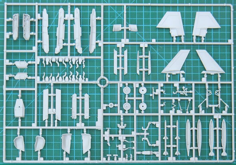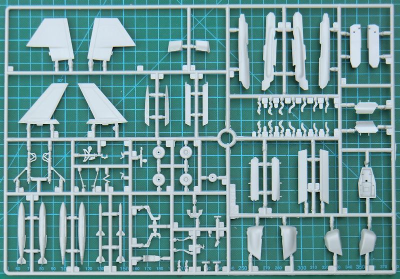 Der Bausatz ist etwas einfach aufgemacht. Im Cockpit gibt es eine einfache Wanne. Die Instrumente werden durch Decals dargestellt. Der Schleudersitz entsteht aus drei Teilen. Sitzgurte gibt es als Decal. Der Rumpf ist mit den Tragflächen verbunden und es gibt eine Ober- und Unterseite. Die Schächte für Waffen und Fahrwerk sind schön strukturiert. Es gibt auch eine Triebwerksnachbildung. Das Fahrwerk besteht aus wenigen Teilen und ist trotzdem schön detailliert.