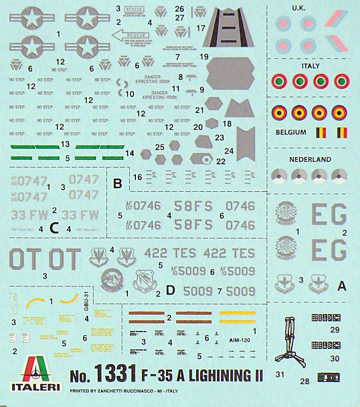Die Waffenschächte können mit zwei GBU-31 und zwei AIM-120 bestückt werden. Für deren Bemalung gibt es separate Pläne und Decals. Alternativ kann die Kanzel offen oder geschlossen montiert werden.