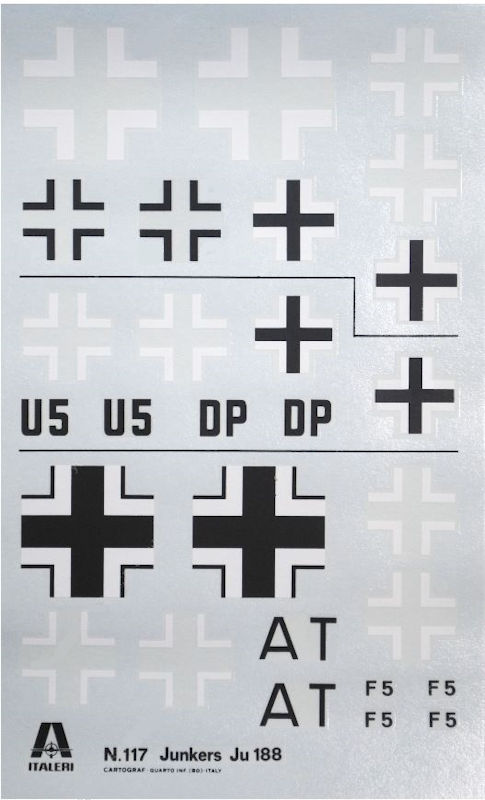 Bemalungen:Meine Meinung wäre, dass hier durchaus schon Italeris "upgraded moulds"- Maßnahmen fällig wären, um die Einsatzzeit dieses Kits nachhaltig verlängern zu können. Ein neuer Abziehbilderbogen und der Aufdruck "Limited Edition" nebst der neuen Boxart reichen hierzu klarerweise nicht! Womit wir nun gleich zu den Decals des Ursprungskits kämen. Von den drei Optionen beinhaltet eine nur Balkenkreuze jedoch keinerlei Kennungen, während die Swastika für die Fine ab Ende der Siebziger Jahre vorsorglich vom Decalbogen wieder entfernt wurde. Jedoch stellte dieser Bemalungsvorschlag keine Sparmaßnahme dar, da dieser Flieger fotografisch belegt ist. Dummerweise trug diese spezielle Maschine des Leutnants Altrogge aber keinen B1-Stand. Nur die auf etwas mehr Authentizität bemühte Firma Testors (die Italeri später sogar aufgekauft hatte), welche stets noch eine weitere Decalsoption mitlieferte, wies darauf hin als sie diese Kits in den Staaten vertrieb. Von der U5+DP (ebenfalls mit abgebauter EDL 151-Kuppel) gibt es in einem englischen Buch zumindest ein Profile. Während die F6+AT lediglich ein Fantasieprodukt von Uwe Feist aus dessen damals gerade erschienenen Squadron Signal Broschüre darstellt(Leider gab es zu Beginn der Siebziger einfach noch nicht so viel Sekundärliteratur wie heute), sodass die Bemalungsoptionen also nicht gerade sehr überzeugend gerieten. Wohl deshalb wurde dem Baukasten in der letzten Ausführung anstatt der wohl eher vagen U5+DP und der fiktiven F6+AT nun eine A3+BH, aus der Kagero-Publikation entnommen, zur Seite gestellt. Wenn auch mit nur weißem anstatt gelben Staffelbuchstaben(sic!). Zumindest wurde zugleich aber auch das irreführende "Fighter Bomber" oberhalb der Boxart entfernt, allerdings nur um durch den unsinnigen Beinamen "Rache" anstatt dem korrekten Rächer ersetzt zu werden.