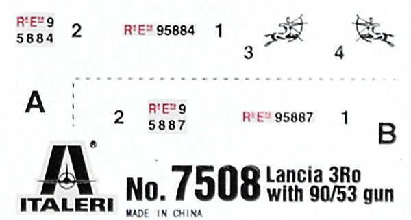 Bemalungen: Der kleine Decalbogen enthält Beschriftungen für zwei italienische Fahrzeuge. Die Bemalungsanleitungen gibt es auf der Kartonrückseite und in der Bauanleitung.