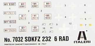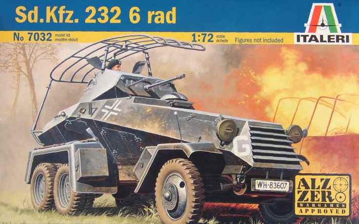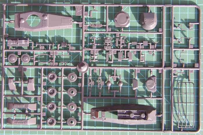Bausatz: Hier hat Italeri offensichtlich das 1:35-Modell (Siehe Bericht von Lutz!) verkleinert bzw. die Daten davon genutzt. Das Modell zeigt ein Fahrzeug vom Büssing NAG mit dem früheren Waffenblende. Ein Spritzrahmen enthält alle Teile. Die Wiedergabe der Bauteile ist sehr gut. Einige Gravuren sind jedoch für diesen Maßstab zu grob bzw. unnötig, da sie Schweißnähte darstellen sollen. Die Darstellung der Antennenanlage geht für 1:72 völlig i.O. Beide Läufe der Bewaffnung sind gut reproduziert. Eine Verbesserung können hier nur HiTech-Produkte von Robert Schatton bieten. Die Wiedergabe des Reifenprofils entspricht dem Original.