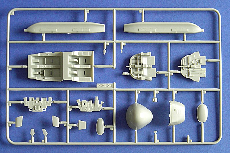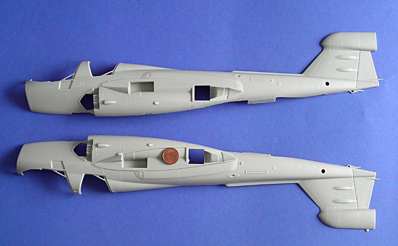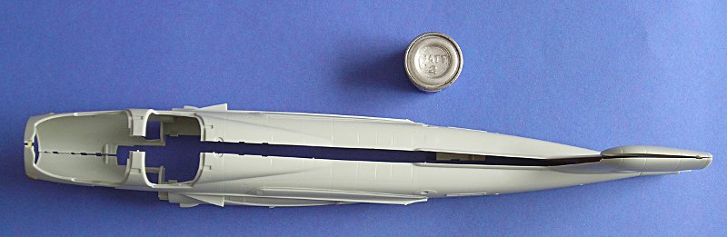 Bausatz: Nach dem Öffnen des Kartons hat mich zunächst die Größe des Rumpfes überrascht. Dieser füllt ohne Radom den ganzen Karton aus. Leider gibt es keine gut Methode diesen Umstand in einem Foto fassbar zu machen, ich habe mal ein Revell Farbdöschen dazugesellt. Dementsprechend sind auch die Angüsse und Gussäste enorm und täuschen etwas über die wirklich gute Oberflächenqualität hinweg. Deshalb und zu einer kleinen Passprobe habe ich den Hauptgussast abgetrennt. Die Passprobe verlief leider nicht so überragend und wegen der Wandstärke der Rumpfteile von einem guten Millimeter und der daraus resultierenden Federkraft dürfte ich hier einige Bäder in Kochendem Wasser einplanen, bevor die Teile glatt zusammenpassen …. hoffentlich geht das gut.