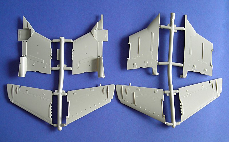 Das Cockpit ist gut einsehbar und ansprechend gestaltet. Aires wird bald auch einen Detailsatz dafür heraus bringen, so dass man sich hier auch noch weiter austoben kann. Die Außenlasten beschränken sich auf 2 Tanks und 3 Elokabehälter sowie eine AGM-88 HARM. Highlight und angesichts der Größe durchaus willkommenes Detail des Bausatzes ist der Faltmechanismus des Flügels.