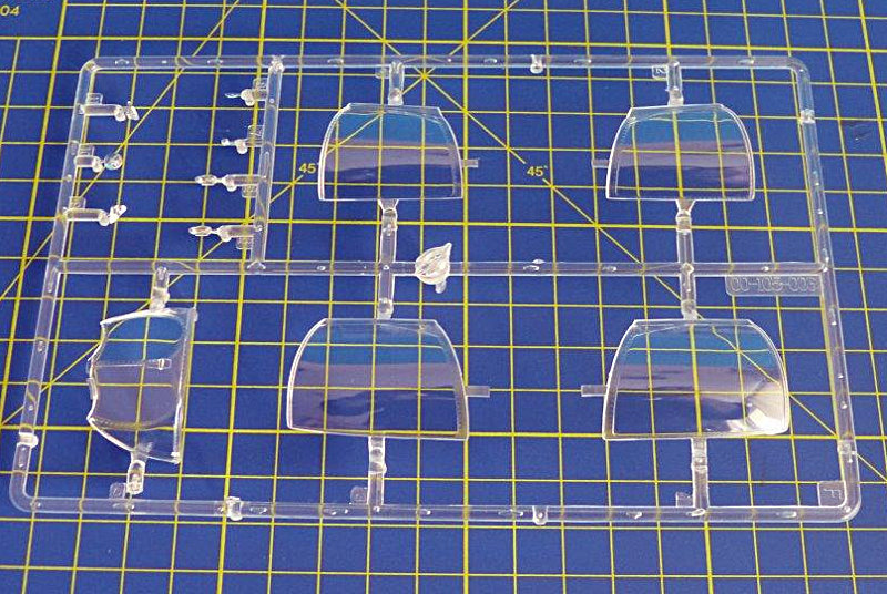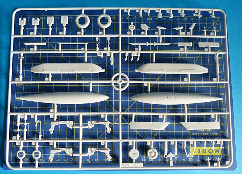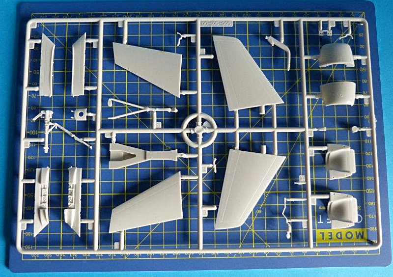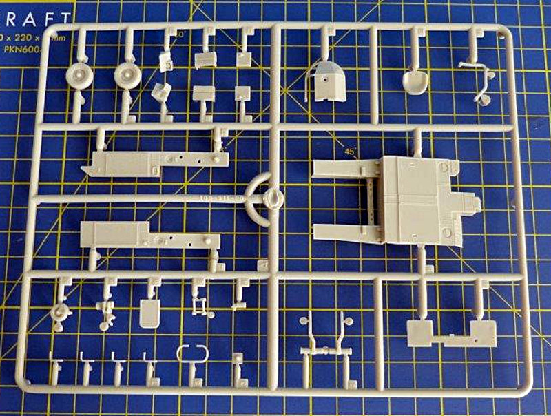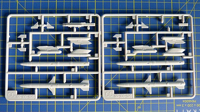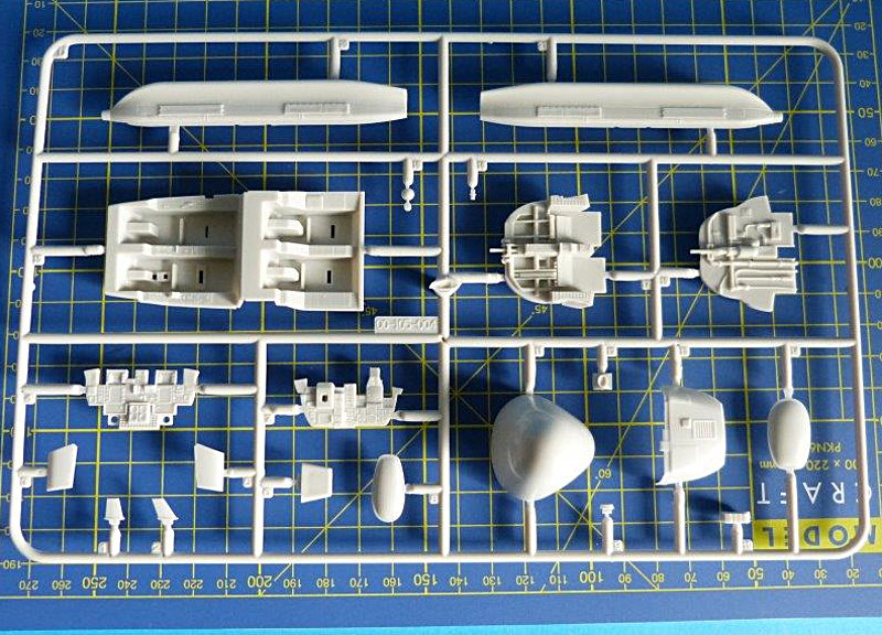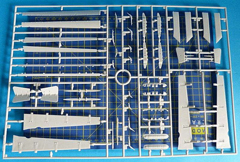 Der Bausatz: Der große und stabile Stülpkarton ist mit 14 Gußrahmen bis zum Rand gefüllt. Alle Spritzrahmen sind vorbildlich in einer durchsichtigen Verpackung bruchsicher verpackt. 12 Spritzlinge sind in hellgrauem Material gehalten. Ein Spritzling aus Klarsichtmaterial beinhaltet die Cockpithauben, Positionsleuchten und Landescheinwerfer. Die Cockpithauben sind zweigeteilt und erfordern beim Verkleben besondere Vorsicht. Als besonderer Zusatz liegt dem Bausatz ein Pushbacktraktor (A/S32A-32) bei, der auf modernen amerikanischen Flugzeugträgern Verwendung findet.