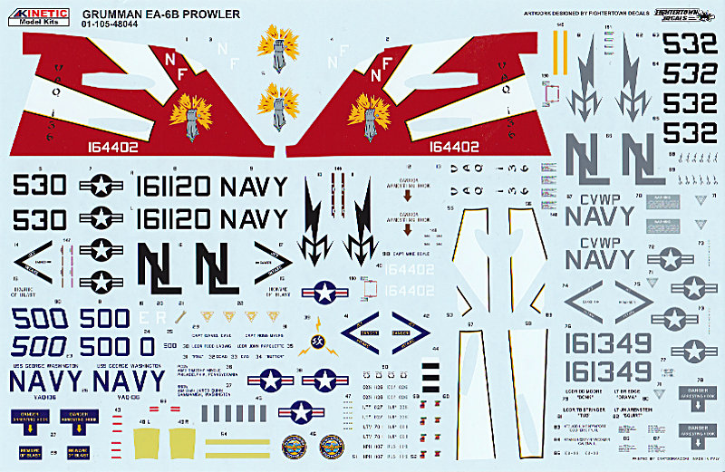 Decals und Lackierung: Der hervorragende Decalbogen wurde von Fightertown Decals konzipiert und von Cartograf gedruckt. Er ist hochglänzend, wodurch der schon von Haus aus dünne Trägerfilm kaum sichtbar ist. Er erlaubt den Bau von drei Einsatzmustern der EA-6B Prowler.