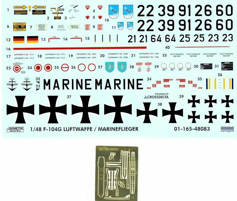 Der Cockpitbereich ist gut detailliert, zwei Schleudersitze sind vorhanden, das Gurtzeug kann mit Fotoätzteilen dargestellt werden. Für das Instrumentenbrett gibt es kein Decal (bei Kinetic leider üblich!). Die Beigabe von Ätzteilen ist sicherlich nützlich, aber für eine angemessene Wiedergabe des Gurtzeugs für den Schleudersitz sind die bereits o. erwähnten farbigen Ätzteile von Eduard eine lohnende Anschaffung oder es wird einem Anbieter von Resin-Schleudersitzen der Vorzug gegeben.