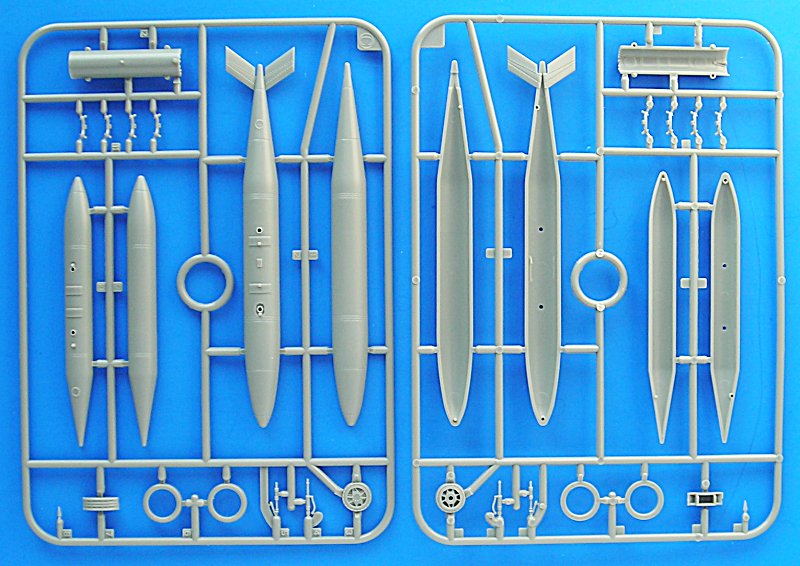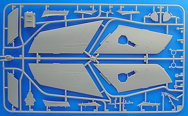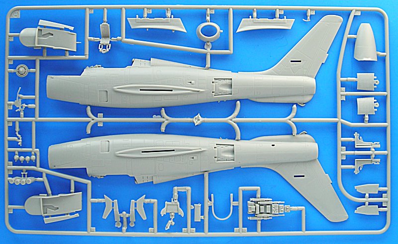 Doch zurück zum Modell. 5 sauber abgespritzte Gießrahmen liegen im stabilen Karton. Die versenkte Gravur ist etwas breiter als von den neuesten Spitzenprodukten aus Japan gewohnt, aber nicht schlecht. Die rauhe Oberfläche verstärkt einen leicht verwaschenen Eindruck. Ich hatte die Rumpfhälften in etwa 15 Minuten poliert, also ist dieses Manko für jeden - der es will - behebbar. Für einen "Naturmetall-Anstrich" sollte man auf jeden Fall etwas Zeit dafür investieren. Bei getarnten Maschinen kann man vielleicht ohne diese Arbeit auskommen. Zur Vorbildtreue kann und möchte ich mich nicht äußern. Dem Vernehmen nach ist das Modell eine optimierte "Kopie" des Monogram Bausatzes (mit allen Vor- und Nachteilen - siehe z.B. Review by Tom Cleaver). In den bekannten Foren findet man sicher einige weitere Diskussionsstränge, die Genauigkeitsfreaks weiterhelfen. Von AMS Resin gibt es für die verschiedenen Modelle und Ausführungen der 48er F-84F "Update Sets".