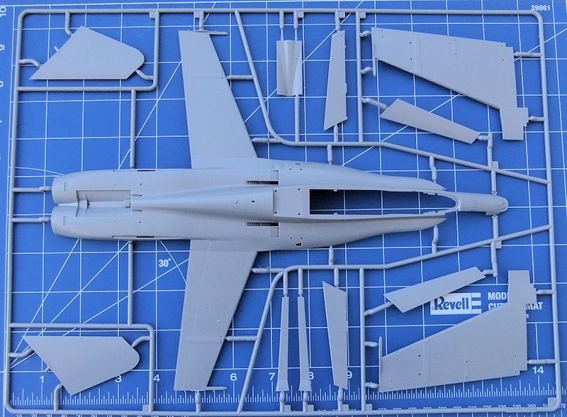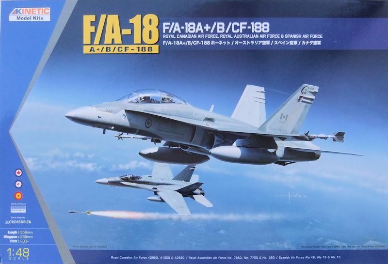 Bausatz: Der Bausatz von Kinetic, aus völlig neuen Formen, kann ohne Überteibung als Hornet Modell in XXL bezeichnet werden, wobei sich das nicht auf den Maßstab bezieht. Der Inhalt des großen Stülpkartons, übertrumpft alle sonstigen Modelle dieses Jagdbombers. Auf dem Karton ist die Anzahl der Einzelteile mit 280 angegeben. Es handelt sich dabei sicher um die Teile, welche für den Zusammenbau für einen der vielen Variantenvorschläge aus diesem Bausatz vorgesehen sind, die übrigen Teile wandern dann in die Vorratskiste.