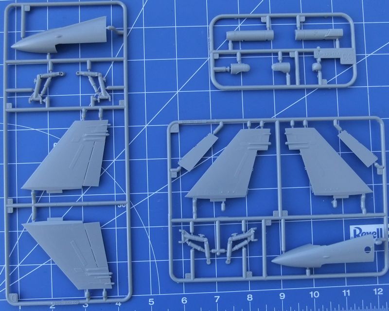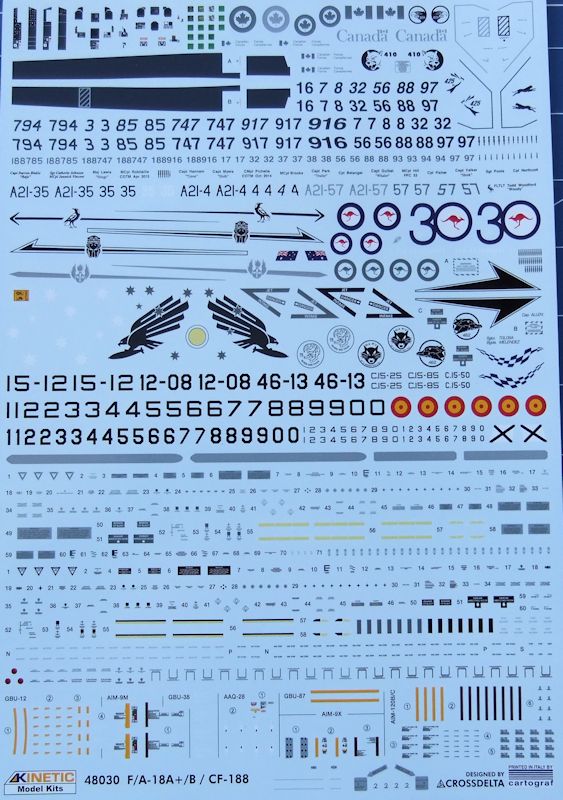 Die Teilefertigung gehört zu dem Besten was ich jemals auf den Tisch gehabt habe. Das betrifft die Gravuren ebenso wie alle sonstigen Prägungen des Bausatzes. Um das Modell dynamisch wirken zu lassen, können die Vorflügel und die Landeklappen in verschiedenen Stellungen angebaut werden. Dasselbe gilt auch für die Höhen- und Seitenruder. Auch die obere Luftbremse lässt sich offen darstellen. Das Cockpit ist nahezu perfekt ausgestattet. Nicht einmal die vielen Kabel fehlen. Für die Instrumente, welche ausschließlich aus Bildschirmen der Bordcomputer bestehen, liegen die nötigen Abziehbilder bei. Die Kanadier haben auf der Unterseite der Maschine falsche Kabinenimitationen aufgemalt. Auch diese befinden sich auf den Bogen. Die verschiedenen großen Kabinenhauben haben nicht die gefürchtete Mittelnaht, wie sie bei dieser Formengestaltung leider oftmals zu bemängeln ist.