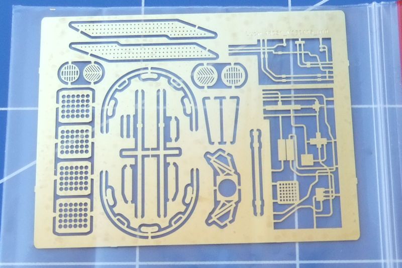 Auf der kleinen Platine mit Messingteilen befinden sich neben den Rahmen für die Kabine mit den Rückspiegeln auch Verkleidungen für die Lüfterzugänge an der Maschine auch Kabel für die Fahrwerksschächte und das Visier des Piloten. Für alle Flugzeuge sind die manchmal recht kleinen Unterschiede berücksichtigt. Sei es im Cockpitbereich, bei den Fahrwerken oder der Elektronik außen an der Zelle.