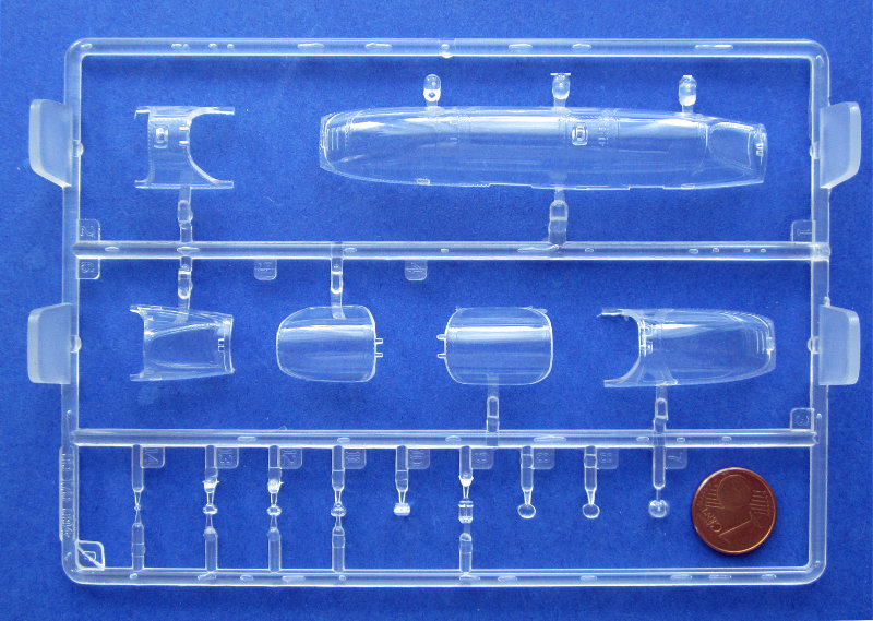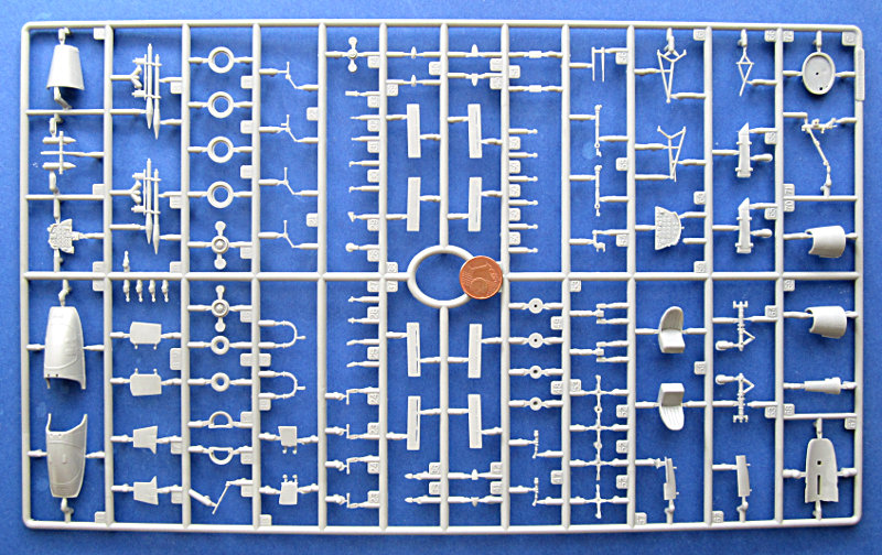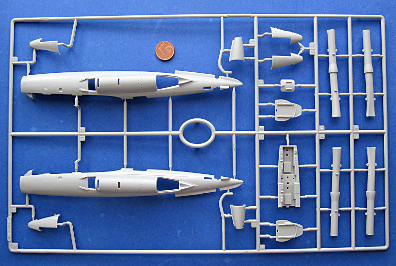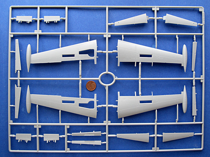 Die Spritzlinge sind von der inzwischen guten Kinetic Qualität. Die Oberflächen sind leicht seidenmatt und die Gravuren sind scharf und gleichmäßig tief. Sie beschränken sich auf die größeren Strukturen, Nietenreihen sucht man also vergebens. Wobei letztere ohnehin Geschmackssache sind. Offensichtlich gab es beim Rumpf ein paar Probleme beim Auswurf der Teile. Es sind im Bereich des Triebwerks einige leichte Scharten zu sehen. Auf dem Flügel und unter der Cockpitkante kann man außerdem leichte Senkungen sehen.