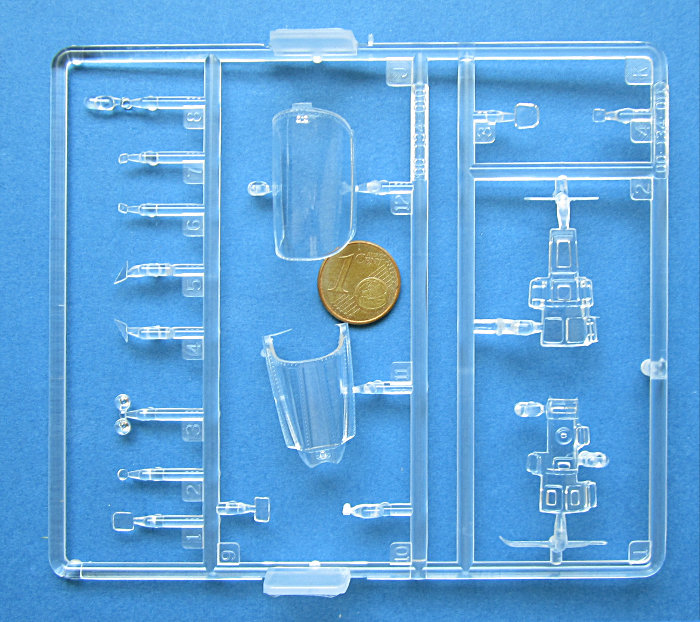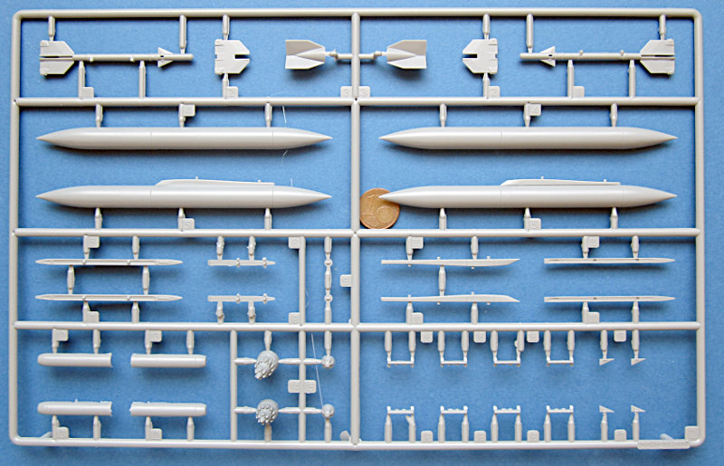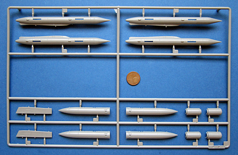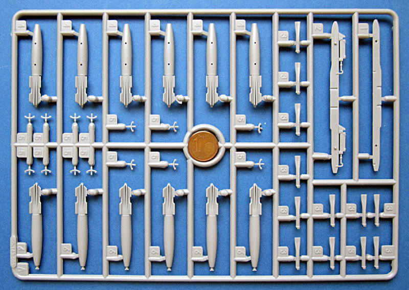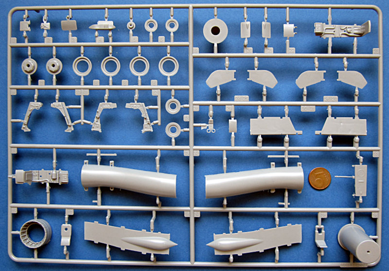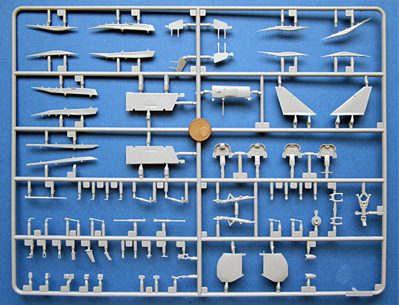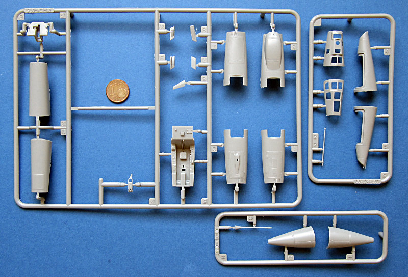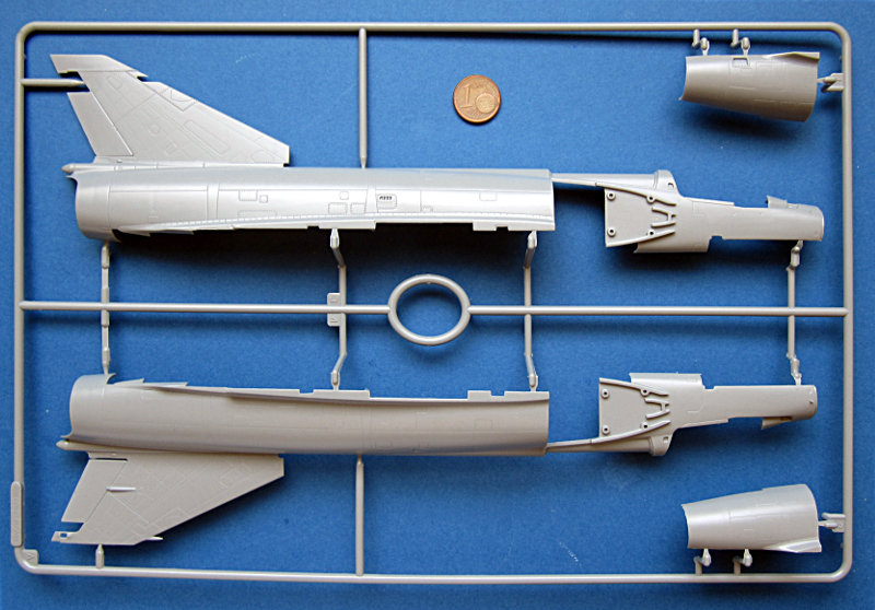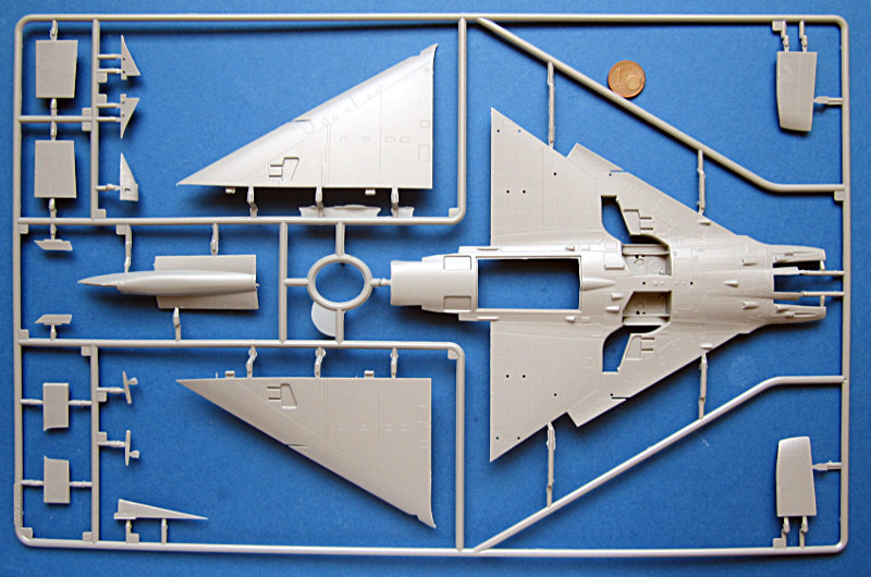 Der Spritzguss entspricht dem derzeitigen Kinetic- Niveau und kann nicht ganz mit den besten mithalten. Die Oberfläche ist etwas rau und es gibt auch ein paar Sinkstellen. Die Gravuren sind vergleichsweise breit (aber keine Matchboxgräben) und etwas ausgewaschen. Insgesamt ist das aber in Ordnung. Auf der Flügelunterseite sind die Lufthutzen und die Defa-Kanonen mit angegossen. In den voll ausgeprägten Lufteinläufen gibt es Auswerfermarken, ansonsten sind diese aber an später nicht sichtbaren Stellen angebracht. An den Gießrahmen gibt es hier und da etwas Flash (zwischen den Formen ausgetretenes Plastik), die Teile sind davon aber nicht betroffen.
