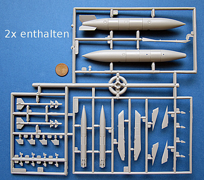 Am Ende der Bauanleitung werden auch die möglichen Aufhängungspunkte gezeigt. Jede Bemalungsvariante zeigt die jeweils Optionen für die Bemalung von Abwurflasten. Die Verwendung von Lasten unter dem Rumpf wird nicht gezeigt (centerline).