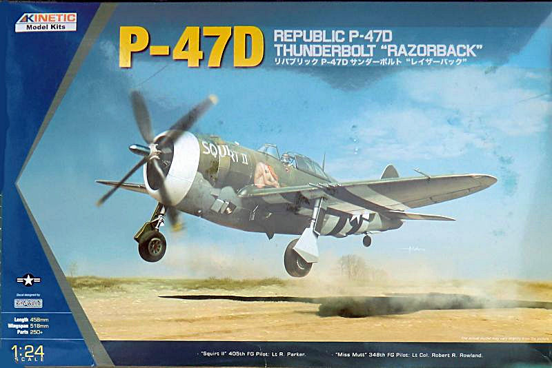 Bausatz: Kinetic brachte 2014 schon die späte Variante der P-47D mit Blasenhaube heraus. Nun folgte eine frühe Razorback genannte Variante in 1/24. Bei der späten P-47D handelte es sich allerdings um eine Neuauflage des Vintage Fighter Series-Bausatzes aus dem Jahre 2008. Nun gibt es aber alle Teile für die frühe Razorback. Der ungewöhnlich hohe Karton bleibt ein außergewöhnliches Merkmal dieses Kinetic-Bausatzes. In dem praktischen Stülpkarton befinden sich gut verpackt acht hellgraue Spritzlinge mit 285 Teilen, 15 Klarsichtteile, zwei Gummireifen, die übersichtliche Bauanleitung und ein großer Decalbogen.