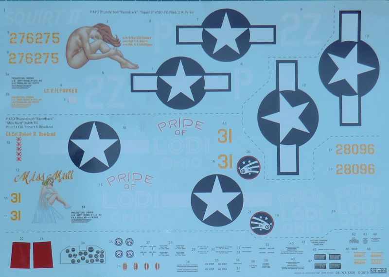 Die Bemalungsanleitung ist leider nur schwarz/weiß aber mit vielen Grauschattierungen. Kinetic liefert Farbangaben für die Systeme von Vallejo, Model Air, Mr. Color, Italeri, Humbrol und Tamiya. Der Decalbogen ist von Cartograph tadellos auf einem blauen A4-großen Bogen gedruckt. Es gibt gute Wartungshinweise. Leider gibt es bei der "Miss Mutt" eine falsche Serial-No.